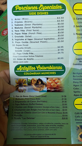 If you're in the mood for something more special, the Bandeja Paisa offers a feast of flavors, though be sure to note it’s not available with side dishes like Tostones or Yuca frita. For seafood lovers, the Mojarra and Sopa De Mariscos are a real treat, while meat lovers can enjoy the Chuleta Colombiana or Filete De Pescado Empanizado.